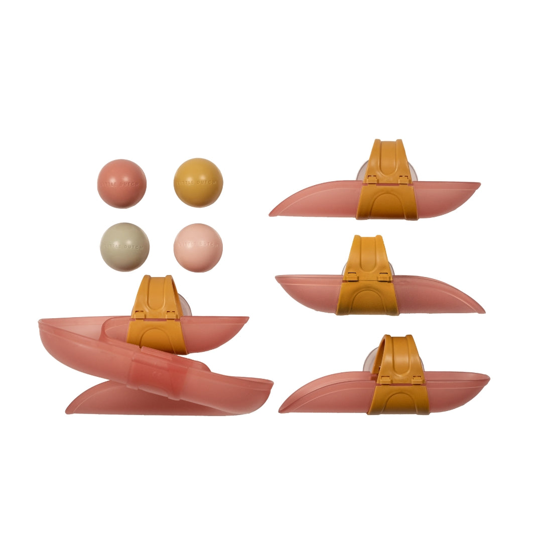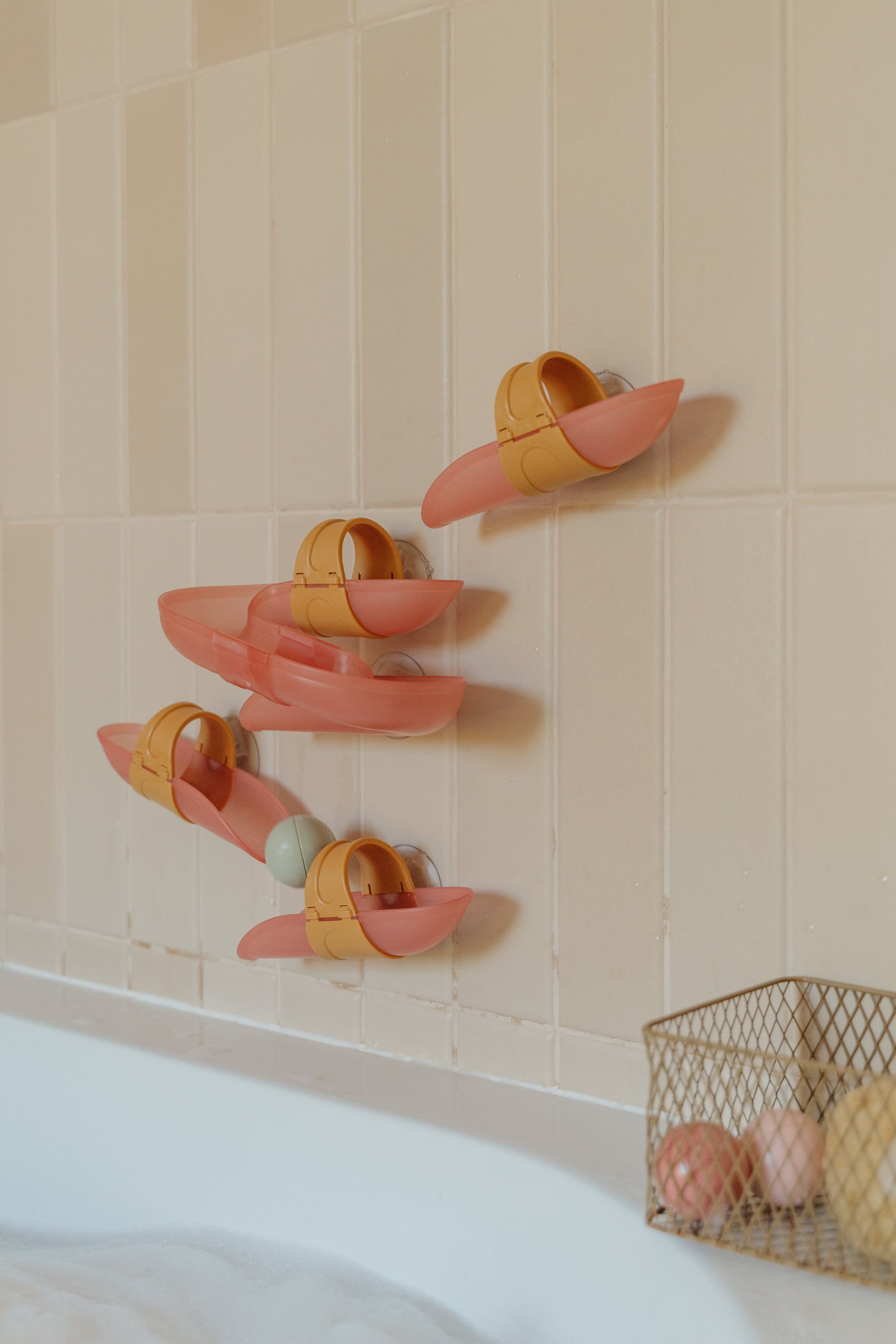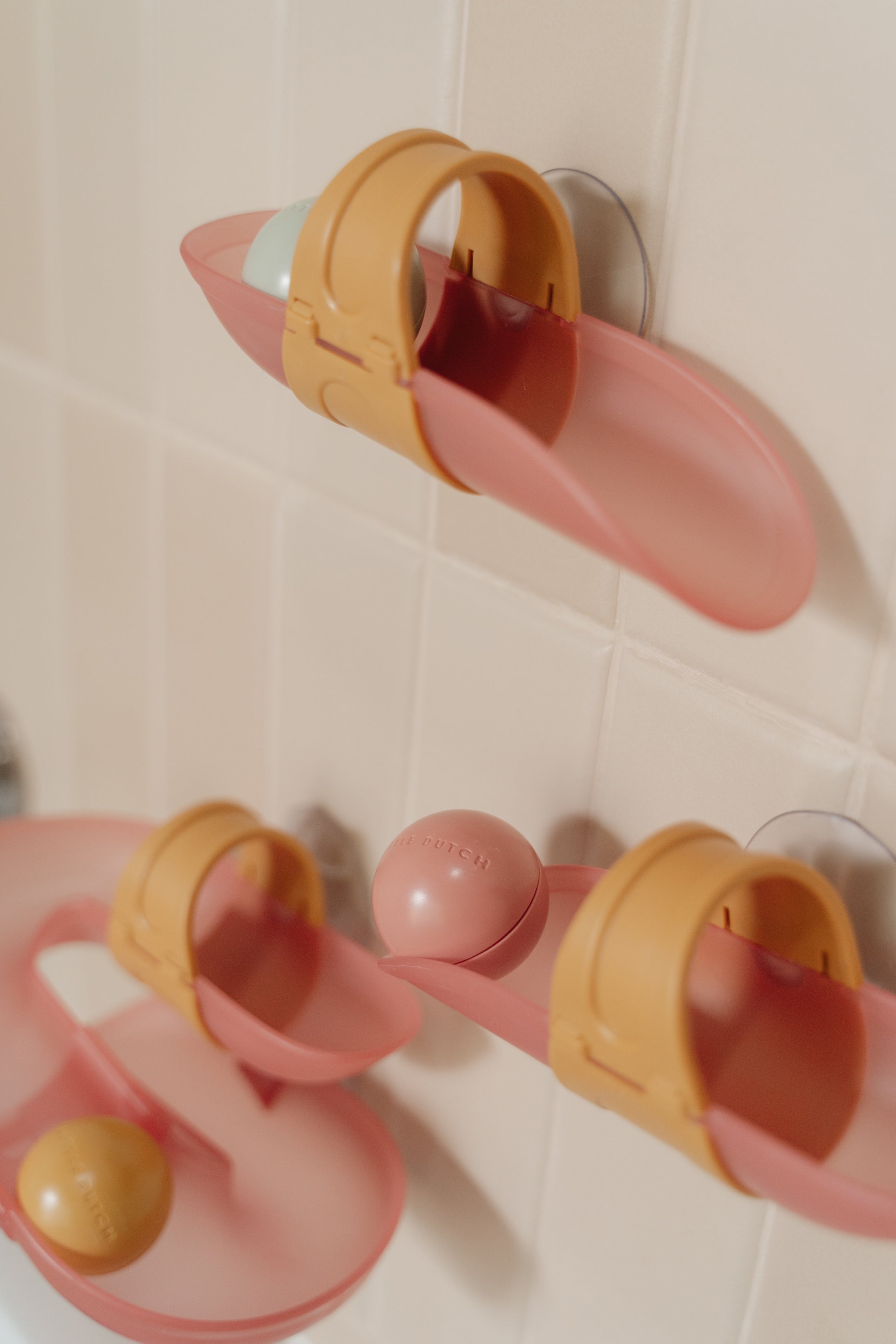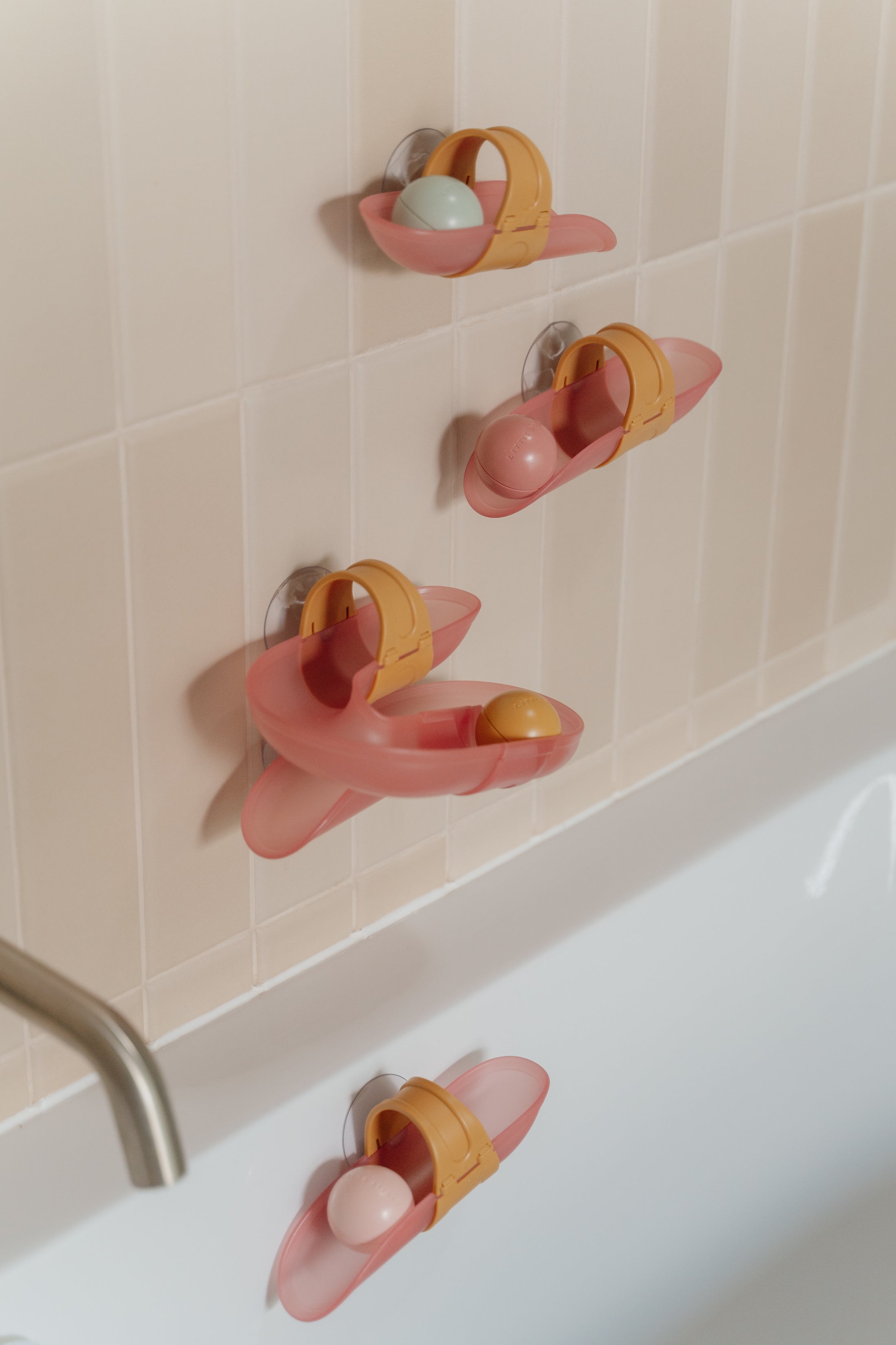 Here comes the ball and … SPLASH! Make bath time a rolling adventure! Set up the tracks on the bathroom wall and let the ball roll down for splashes of fun in the bathtub. This bathtub ball track set will turn the bathtub into your little one’s favourite play aera. The 3 pink tracks have a suction cups that are easily attached to and removed from the bathroom wall. Thanks to the curved and straight shapes there are endless courses to be created. Great entertainment that also helps fine motor skills and problem solving.