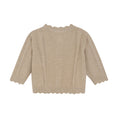 Elegant knitted sweater with a round neckline, detailed frill collar, and matching frill details at the sleeve edges. The front design features twisted details and embroidered flowers, creating a classic and girly look. Perfect for both everyday wear and special occasions. Certified acc. to GOTS - organic CERES-0366