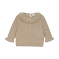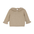 Elegant knitted sweater with a round neckline, detailed frill collar, and matching frill details at the sleeve edges. The front design features twisted details and embroidered flowers, creating a classic and girly look. Perfect for both everyday wear and special occasions. Certified acc. to GOTS - organic CERES-0366
