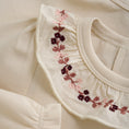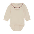 Cute long-sleeve bodysuit featuring a beautiful collar adorned with embroidered floral details. The bodysuit has elasticated cuffs, creating delicate frill details, and snap buttons at the neck and between the legs for easy dressing.