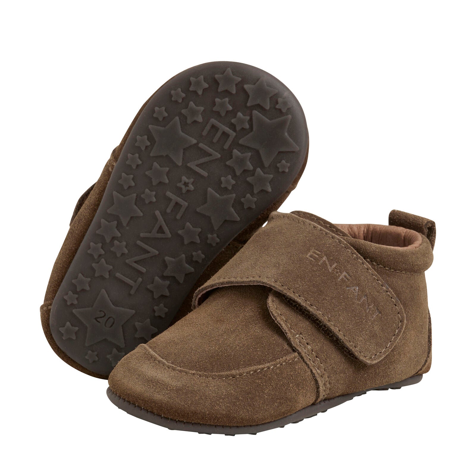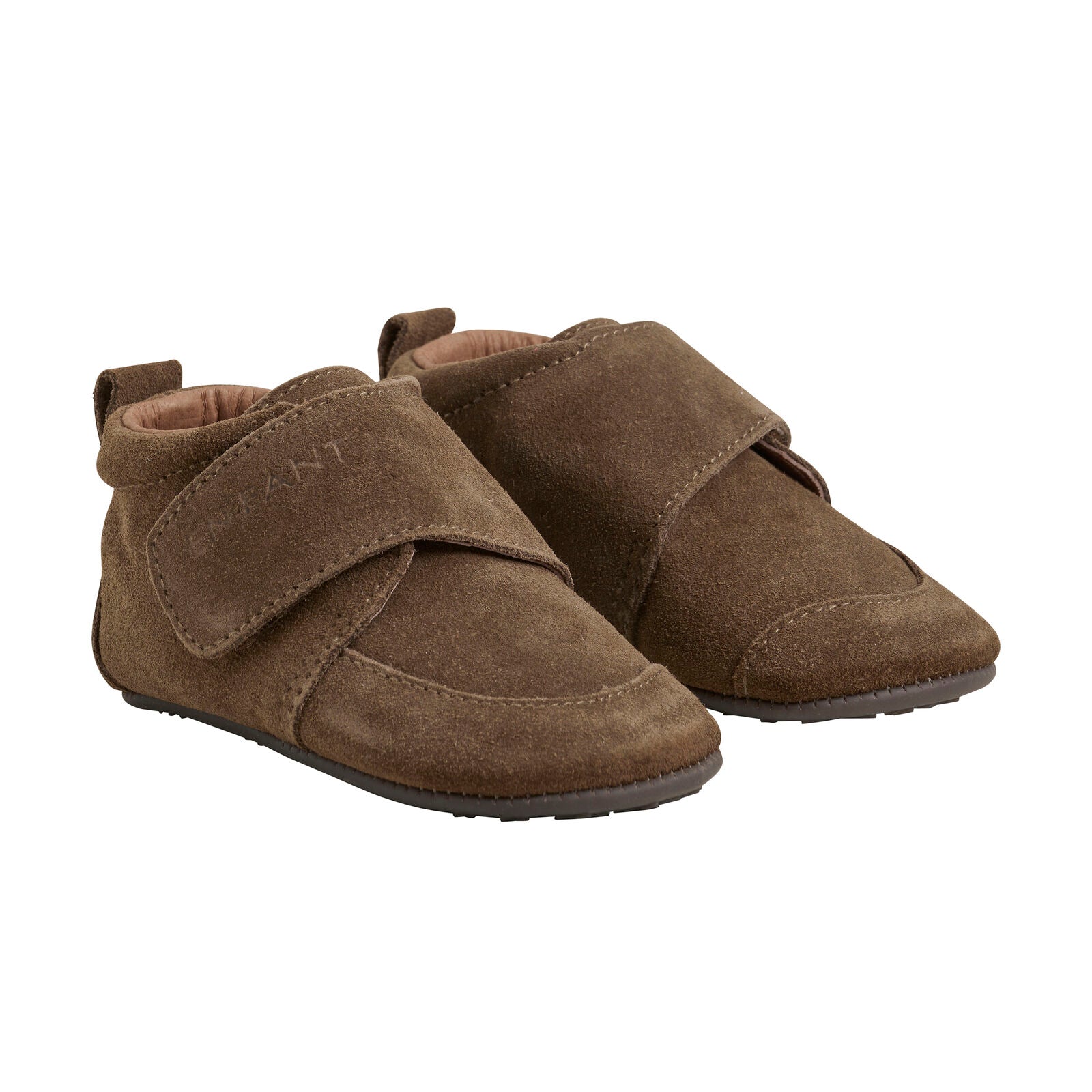 Solid colored leather slippers from Enfant. Good and comfortable fit. Made of suede. Closes with a wide velcro closure with Enfant logo on the side. The sole in suede provides a good foothold. A maximum of 1 cm in growth allowance is recommended.