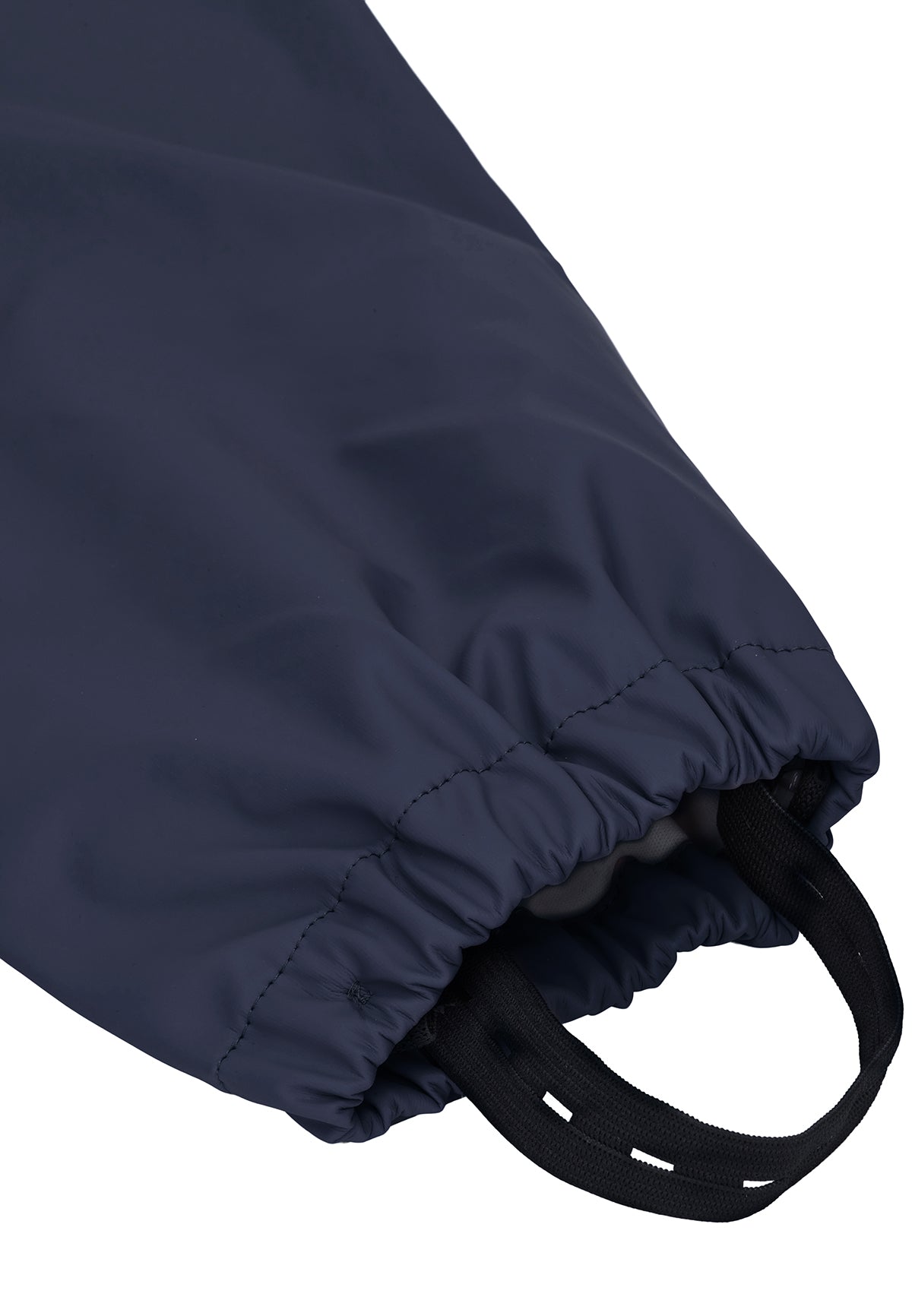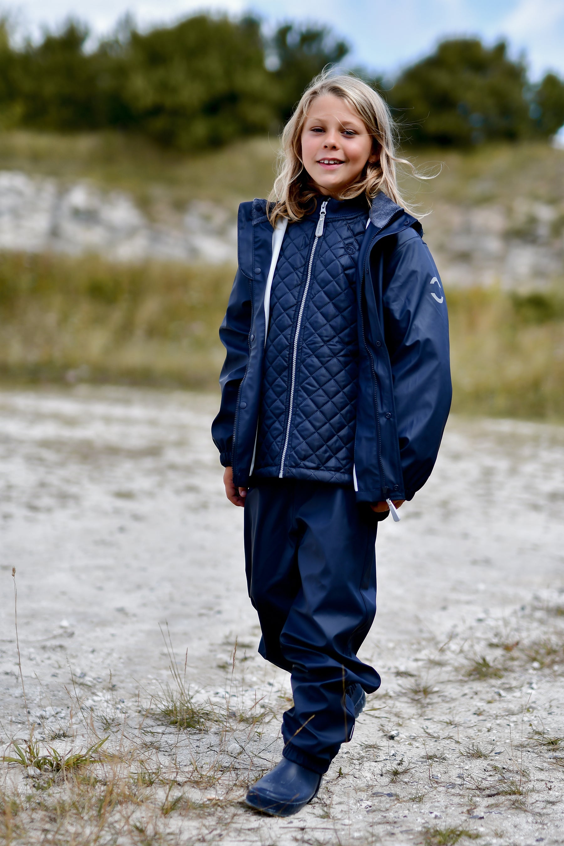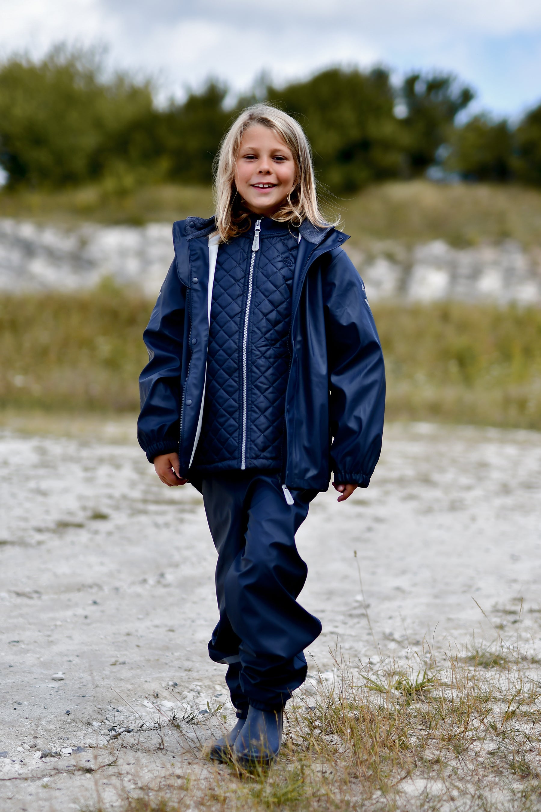 Þetta regnfatasett er úr vatnsheldu efni með 58% endurunnu pólýester og það er hannað fyrir börn til að skemmta sér í rigningunni, hoppa polla, renna sér niður blauta rennibrautina, leika sér í blautum sandkassanum o.s.frv.