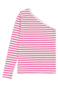 This one-shoulder ribbed top from THE NEW features horizontal stripes, offering a stylish and modern look. With one long sleeve and a single exposed shoulder, it combines comfort with a unique, fashionable design. The soft ribbed fabric ensures a snug fit, making it an ideal choice for both casual and dressed-up occasions. Pair it with jeans, skirts, or shorts for a chic and laid-back outfit. Available in two vibrant colors.