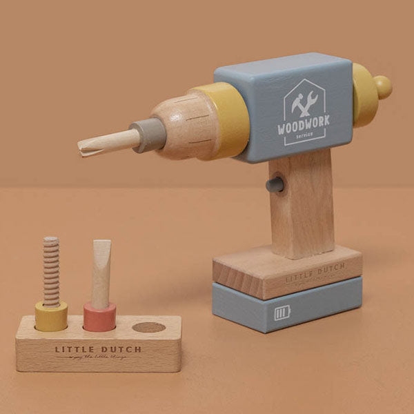 Drill, screw and unscrew! With this wooden toy drill you can fix just about anything. What’s your first DIY project going to be? Pick one of the three interchangeable tips, fix it in the head oof the drill and get started. Turn the wheel on the back to rotate the drill and really get into the carpenter role. Toddlers love roleplay and copying everything their parents do. This pretend play drilling tool inspires imagination and creativity. It also helps to develop motor skills when they exchange the tips, turn the wheel and change the battery that’s attached to the bottom with velcro. Pair with the toolbelt and toolbox to expand to a full set of tools. Or create a personal working area for your little one in the living room with the wooden workbench.