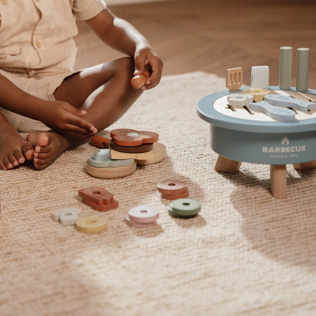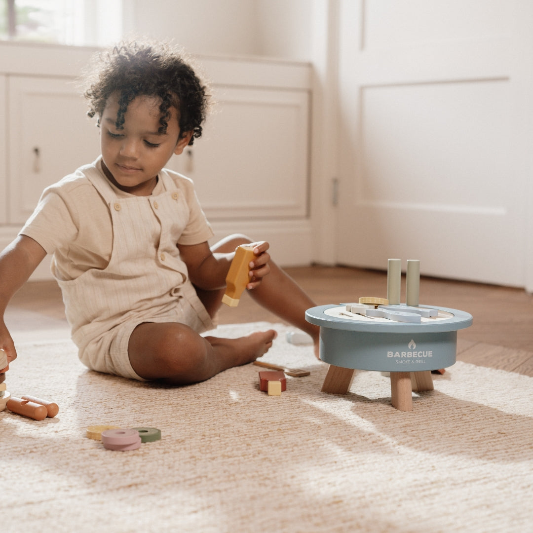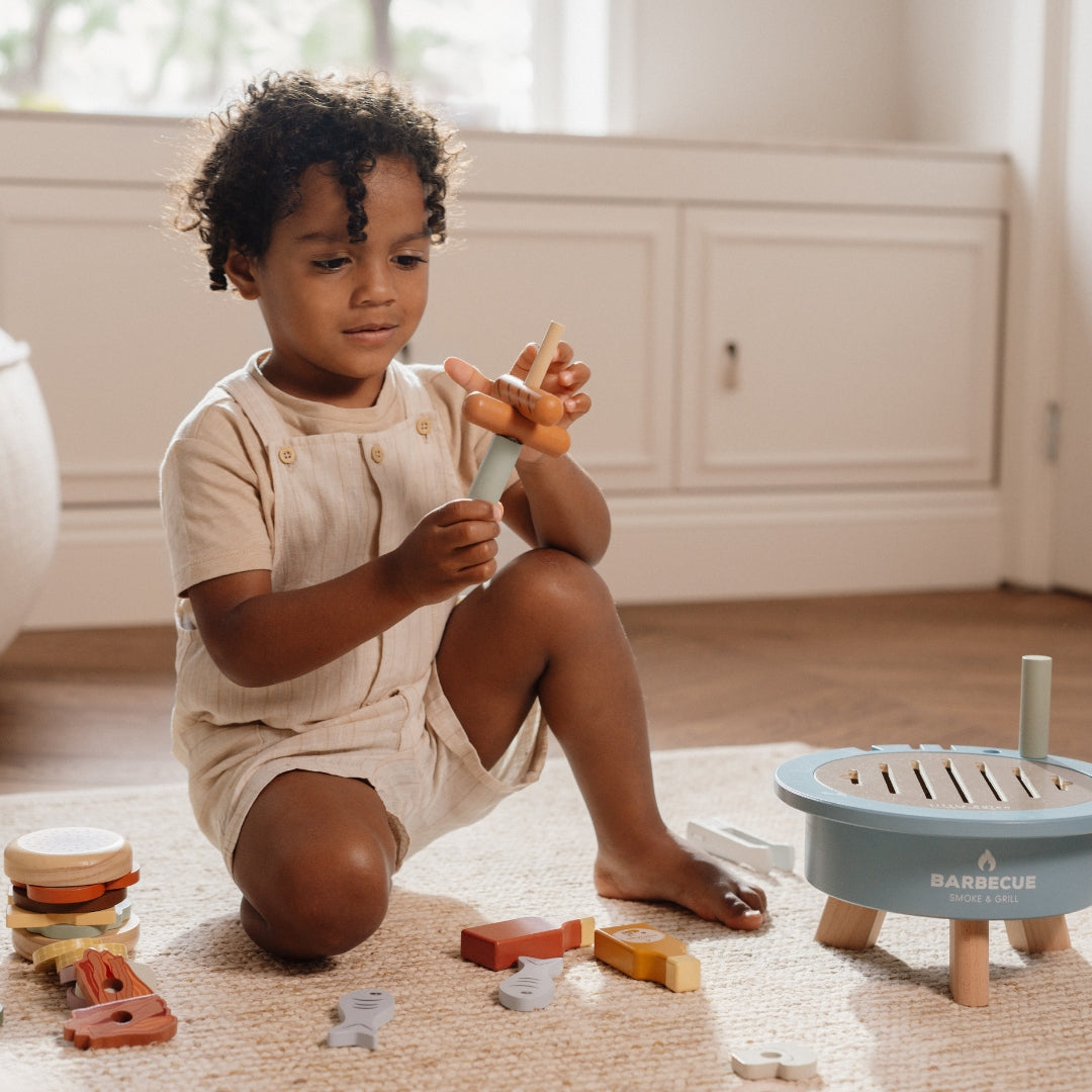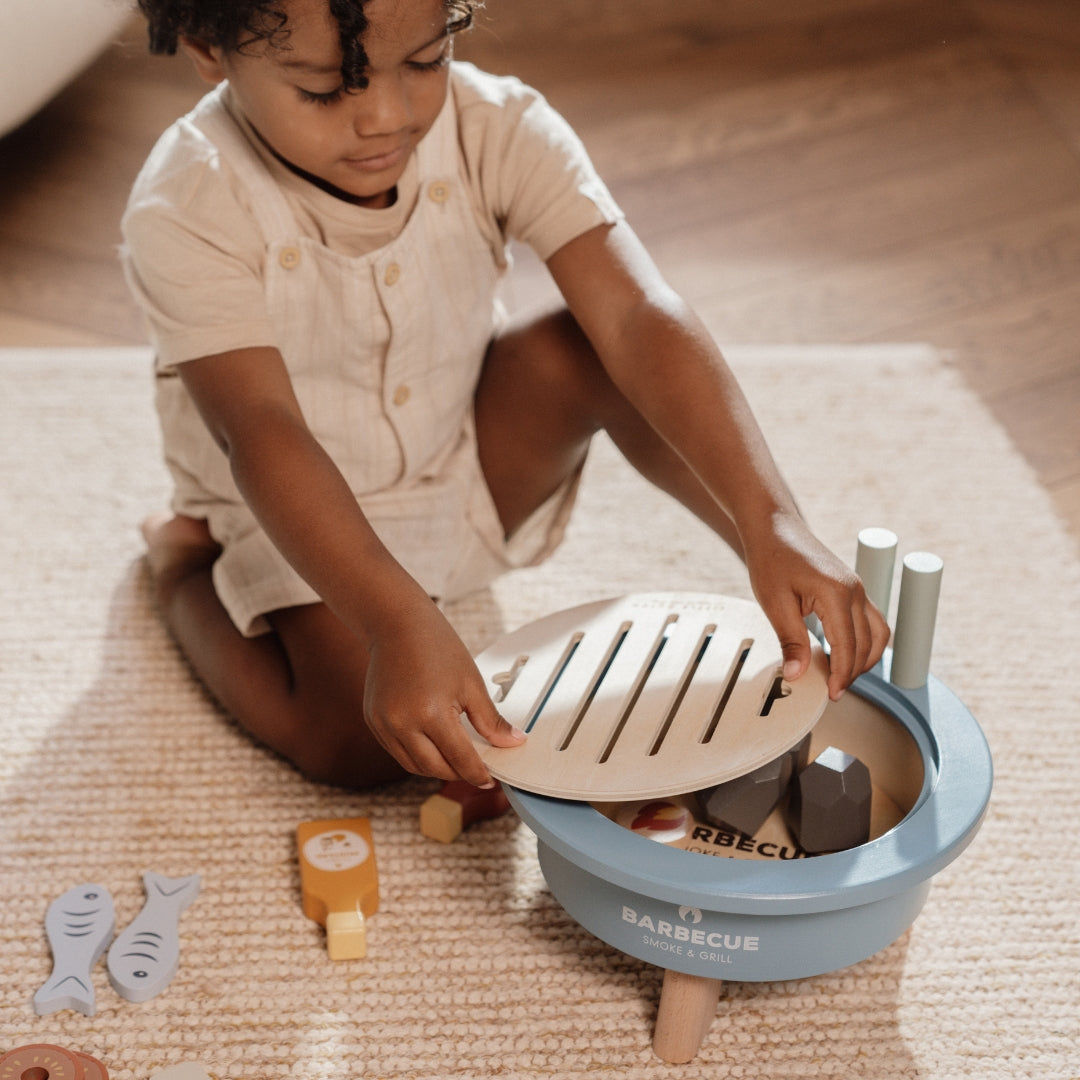 This wooden toy barbecue set includes 34 wooden pieces and comes with tools, a hamburger bun, and for added realism, a removable grill that allows your little one to easily simulate the grilling process. Underneath the grill, a clever storage compartment where you can easily store the various wooden ingredients after playing. This hidden stash includes ketchup, mustard, onions, zucchini, corn, sausages, mushrooms, bacon, fish, and charcoal. Watch as your little one explores the art of grilling, creates delicious wooden meals, and develops creativity through role play with this wooden barbecue toy set.