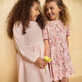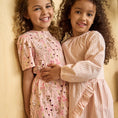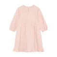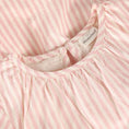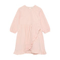 Long-sleeved dress from Minymo with a vertical stripe pattern. The dress features gathered details at the neckline and elasticated sleeve cuffs for a comfortable fit. The lower part is designed with an asymmetrical cut and decorative ruffles that run diagonally across the front and along the hemline.