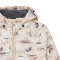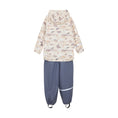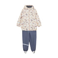 Practical rainwear set in PU from CeLaVi. The set consists of a jacket with an all-over print and a solid-colored bottom. The trousers have adjustable suspenders and click buckles up to size 110, after which they come without suspenders. The trousers have practical and adjustable elastic straps that can be pulled under the footwear. The jacket closes with a waterproff zipper. There are narrow reflective stripes around one arm and one leg. At the top of one arm and on the back of the hood, the logo is printed with a reflective finish. The CeLaVi rain jacket has a detachable hood that is fastened with snap buttons. The hood opening, sleeves, and waist have elastic for a better fit. The set has a water column pressure of 10,000 mm. Certified acc. to GRS - Made with 66% Recycled Material CERES-0366
